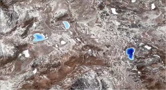 AI计算的湖泊水深叠加卫星遥感影像,湖泊蓝色深浅表示湖泊的深浅。