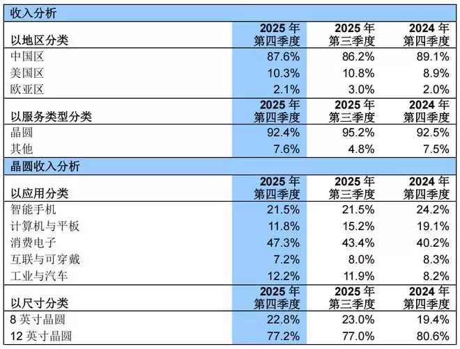 按应用领域划分,中芯国际第四季度收入构成如下:智能手机业务贡献21.5%营收,计算机与平板设备占11.8%,消费电子仍是最大收入来源,占比达47.3%,物联网与可穿戴设备占7.2%,工业与汽车电子领域占比持续提升至12.2%。从区域营收分布来看,中国区营收占比提升至87.6%;美国区占比为10.3%,欧亚区占比为2.1%。
