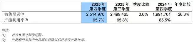 按晶圆尺寸分类,第四季度12英寸晶圆营收占比达77.2%,8英寸晶圆营收占比为22.8%。产能方面,中芯国际月产能由2025年第三季度的102.275万片8英寸约当晶圆,增长至第四季度的105.875万片8英寸约当晶圆。第四季度晶圆出货量达251.4万片8英寸约当晶圆,产能利用率与第三季度基本持平,维持在95.7%。
