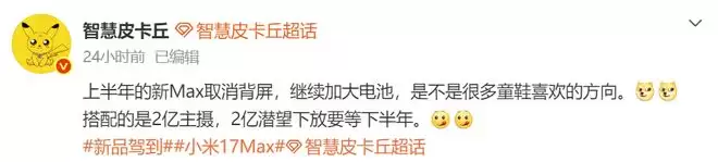 小17+Max确认无副屏:增大电池容量,取消两亿像素