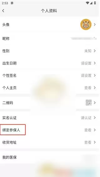 3. 这时会跳转到个人资料页面,请在此页面中找到并点击【绑定参保人】。
