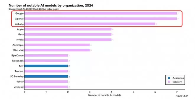 去年4月,斯坦福大学人工智能研究所发布的一份人工智能指数报告指出[4],中美顶级AI大模型性能差距已大幅缩减至0.3%, 入选重要大模型名单的诸多科技公司里,按照模型贡献度排序,阿里位列全球第三,仅次于谷歌与Open AI。