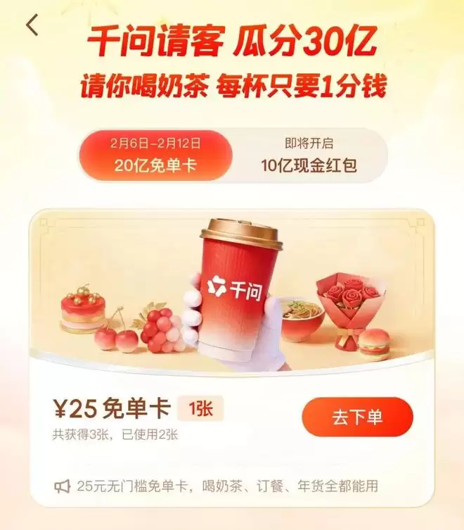 一个月后,阿里旗下的千问宣布投入30亿启动“春节大免单”活动,联动淘宝闪购、天猫超市、盒马、飞猪、大麦、支付宝等阿里全生态,请全国人民在春节期间吃喝玩乐。无论是前无古人的巨额投入,还是独一无二的生态闭环,千问在各种意义上把这场AI大战推向高潮。