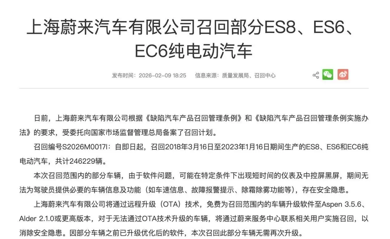 近日,国家市场监督管理总局发布公告,宣布蔚来汽车启动大规模召回计划,涉及自2018年3月至2024年1月期间生产的部分ES8、ES6及EC6车型,总计车辆达246,229辆。这一数字创下蔚来近年来召回规模之最,迅速引发新能源汽车行业与消费者群体的高度关注。作为高端电动市场的头部品牌,此次召回暴露的软件隐患、应对策略以及企业当前的经营状况,已成为市场讨论的焦点。