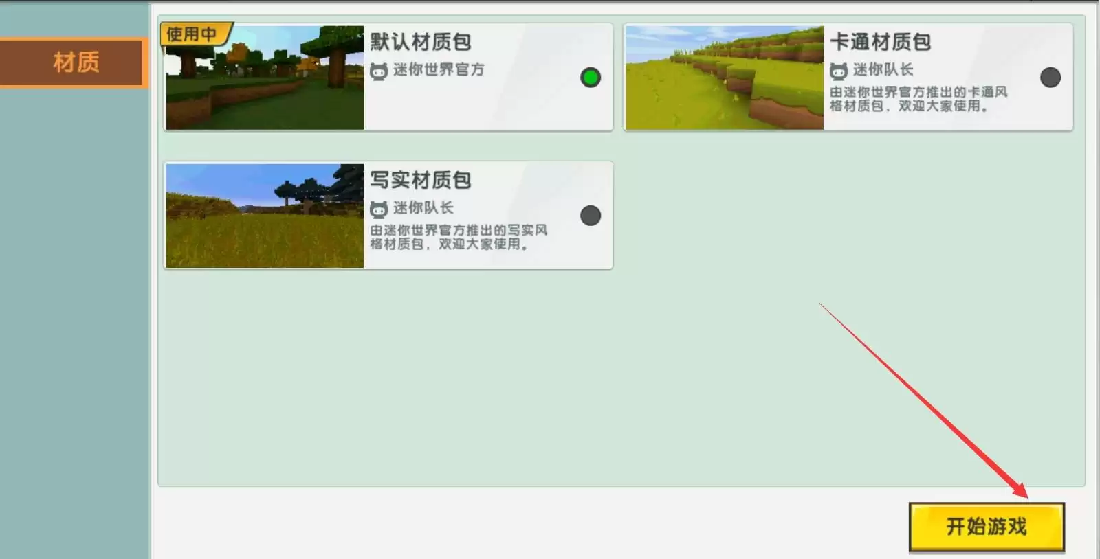 4. 最后,在弹出的列表中选择你刚刚添加的材质包,点击“开始游戏”,就可以在新材质下畅玩了。