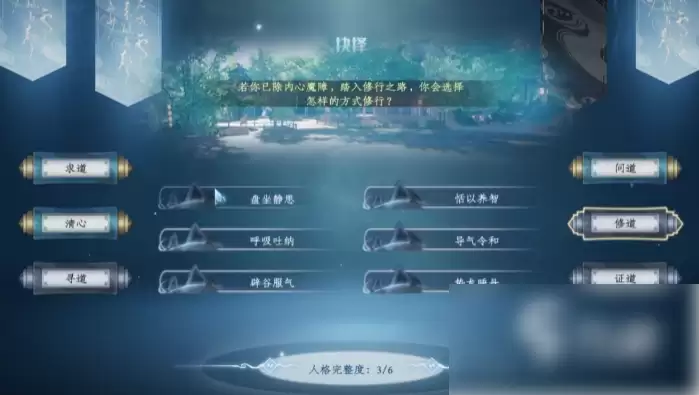 大家按照常规刷取灵根的偏好去选择就行。这里的关键在于歧路的搭配。歧路选择上有两个条目是必选的:问道与清心。之所以要选它俩,是因为它们对五行属性有直接的增益效果。