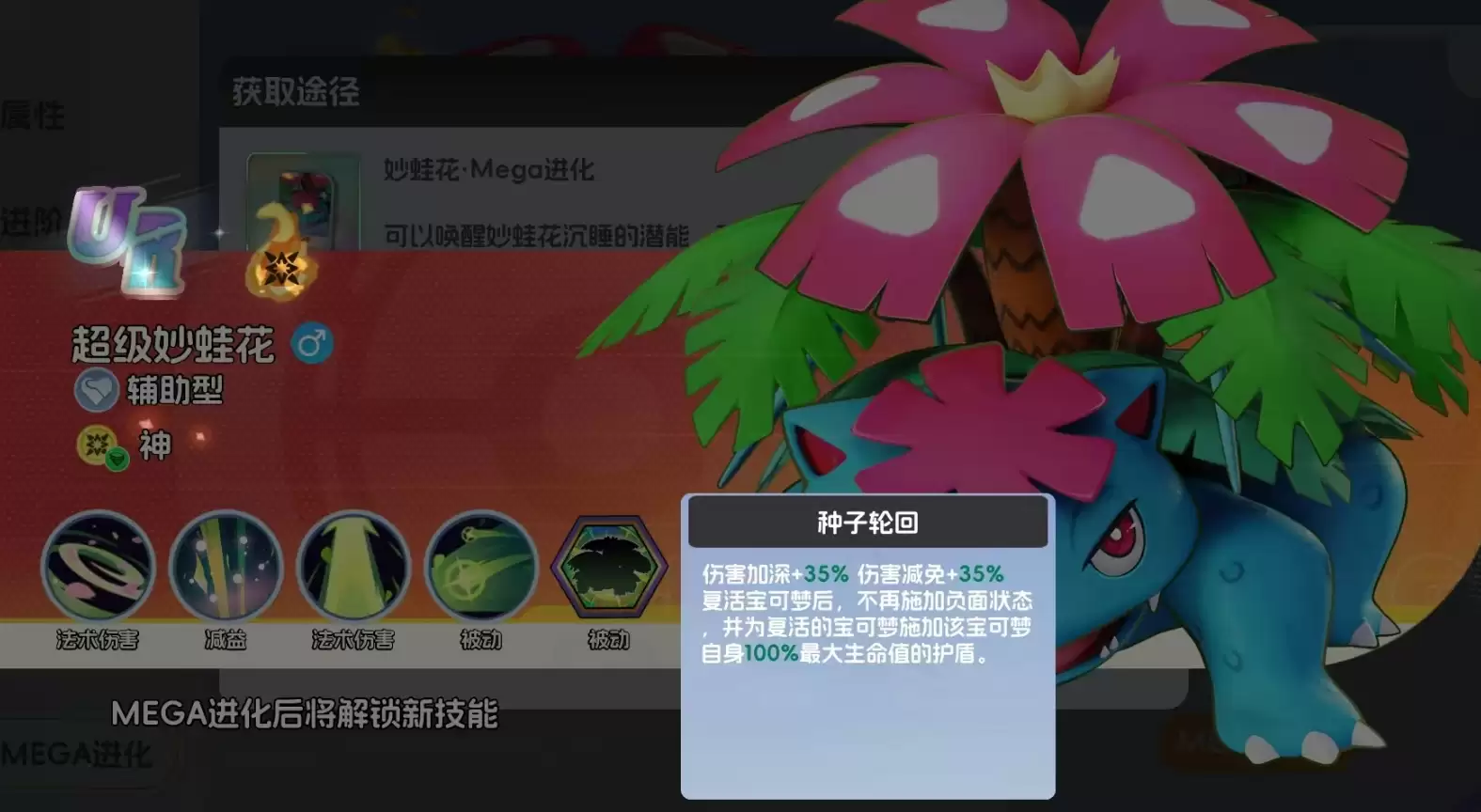 尚未进行MEGA进化前的妙蛙种子本身就具备出色的辅助能力,不仅能为队友提供高额治疗、保障队伍生存,还能对敌人施加睡眠状态,是兼顾治疗与控制的全能型宝可梦。完成MEGA进化后,妙蛙种子将升级为超级妙蛙花,并在突破MEGA进化二阶时获得复活队友的能力,让倒下的队友脱离阵亡状态、重返战场。不过被复活的宝可梦会受到每秒损失6%血量、攻击力降低等负面效果,但这依旧是一项能为全队带来极高增益的技能,也让妙蛙种子拥有极高的MEGA进化价值。