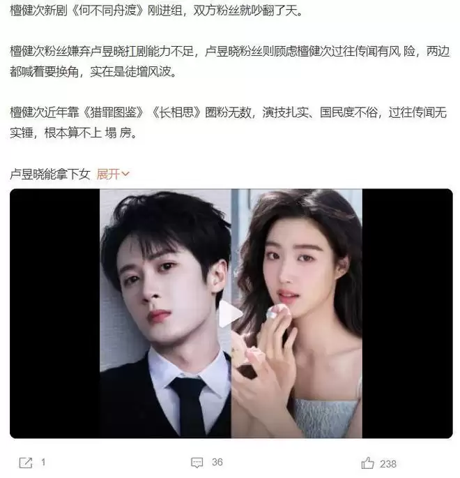 《何不同舟渡》没官宣前,檀健次的粉丝和卢昱晓的粉丝就已经吵起来了,檀健次的粉丝嫌弃卢昱晓没有扛剧能力,而卢昱晓的粉丝认为檀健次有绯闻风险,所以双方都喊着要换角。