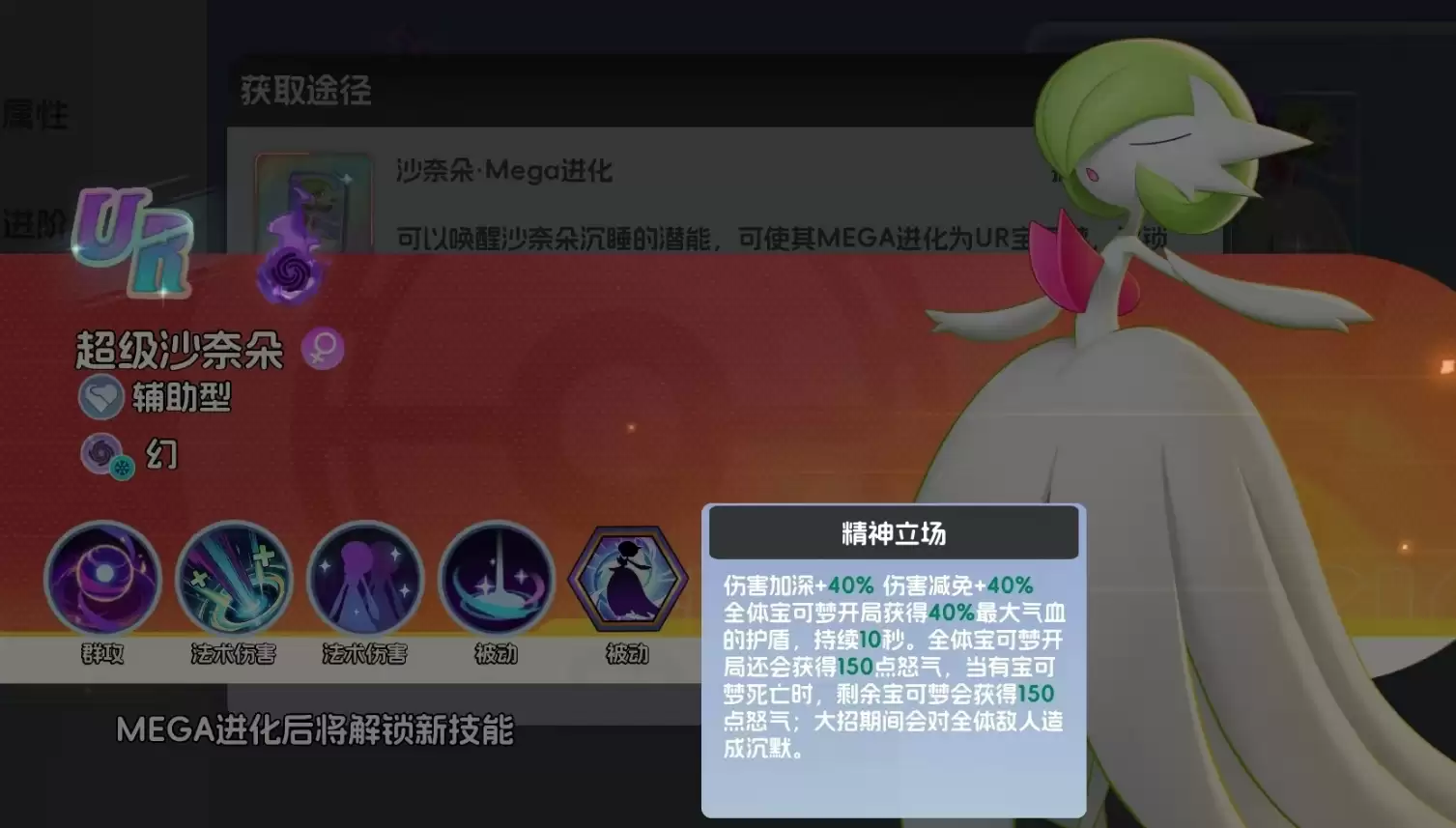 超级沙奈朵是拉鲁拉丝的MEGA进化形态,它继承了拉鲁拉丝的全部能力,能够制造出使敌人沉默的黑洞进行控场。处于黑洞区域内的敌人还会受到移速、攻速双双下降90%的负面效果,同时也能为队友提供诸多增益。当然,超级沙奈朵也具备治疗己方宝可梦的能力,当它释放魔法闪耀时,便能替队友回复生命。若超级沙奈朵不慎受到攻击,它也可以像拉鲁拉丝那样,释放幻想嘲讽住敌人,并用瞬移与敌方拉开距离。此外,开局就能获得100点怒气以及为全体提升12%攻击力的被动,超级沙奈朵也一并进行了继承。