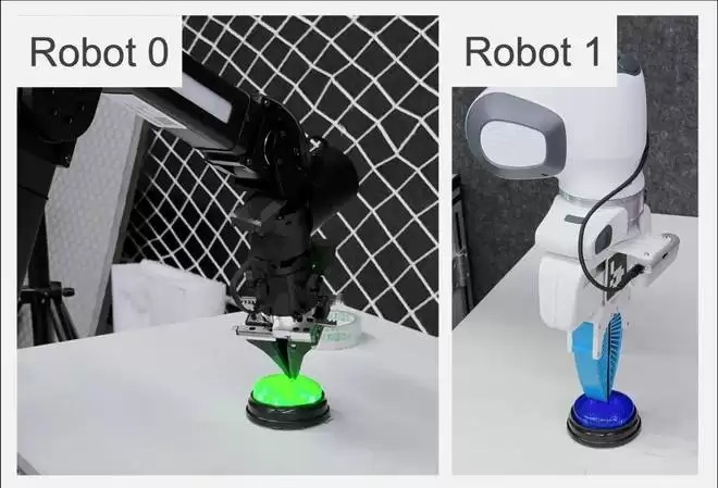 RLinf-USER 完成了一项极具挑战的实验:让两种完全不同的机器人一起学习。