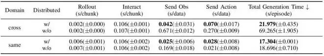挑战:训练节点位于北京(云端),而机器人和推理节点位于数千公里外的深圳(边缘端),中间隔着高延迟、带宽受限且复杂的公网环境。效果:得益于 USER 的隧道网络技术(Tunneling-based Networking)和分布式数据通道,跨域通信的效率大幅提升。实验数据显示,在跨域部署下,单集(Episode)数据的生成时间缩短了约3 倍(从~69 秒 降至~22 秒),实现了如同在局域网般流畅的远程分布式训练。