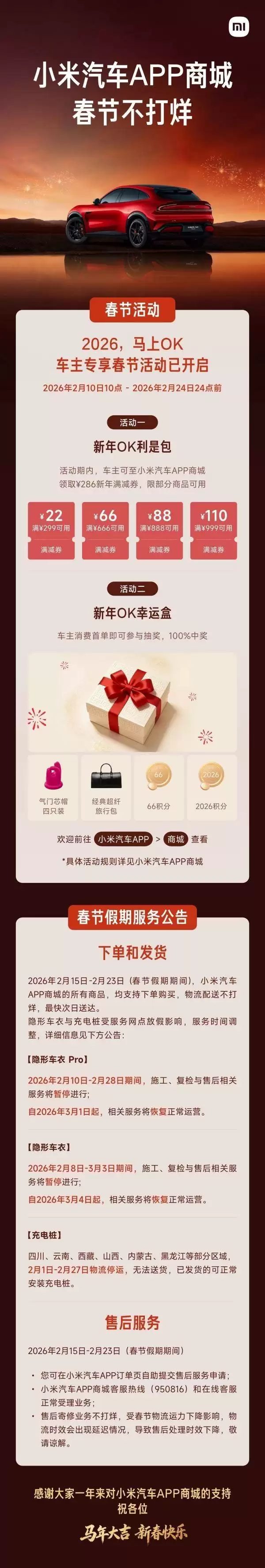 小米汽车近日发布公告,春节期间其官方APP商城将推出系列特别活动,同时部分服务项目将进行临时调整。本次福利活动主要面向广大车主群体,旨在通过多重好礼提升用户节日体验,同时确保基础服务持续稳定运营。