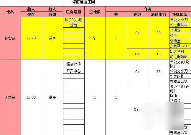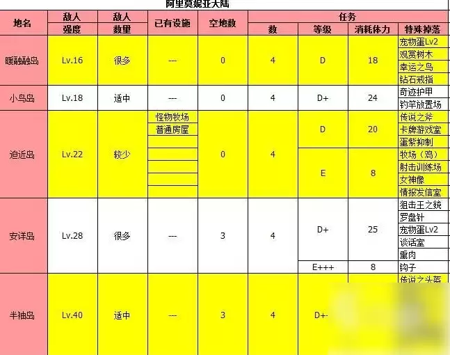 需要注意的是,这两个岛屿前期难度较高,建议至少达到300级船团实力再去挑战,否则很容易徒劳无功。另外值得一提的是,开罗岛产出才能上升药的几率相对较高,虽然这个道具不算特别稀有,但在商店也需要花费20个奖牌才能兑换。后期可以用它来给一些属性一般的伙伴或是主角升满星,尝试不同的科研阵容搭配也颇有乐趣。整个大海贼地带和开罗岛还有机会掉落毕业武器——传说小刀,非常值得反复刷取。其他前期物品的掉落详情,大家可以参考图中的表格信息。