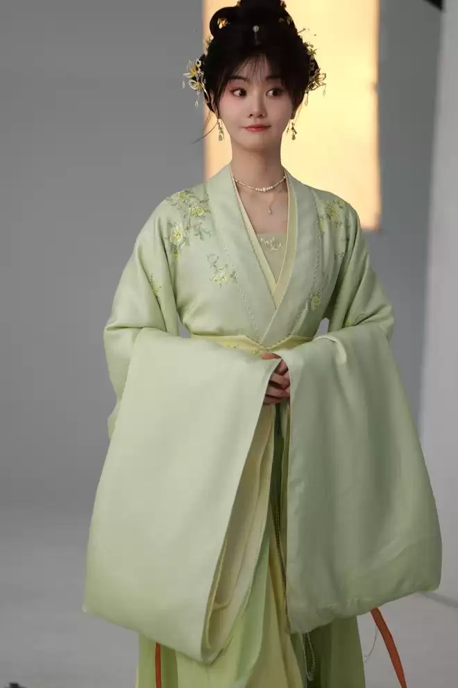 发型以低髻、垂绺、简单簪花为主,不堆砌繁复头饰,修饰脸型轮廓,凸显颈部线条与仪态美感;服饰以米白、浅青、淡粉等浅色系纱质面料为主,裙摆飘逸、水袖轻柔,与胡意旋小巧舒展的身形完美匹配。