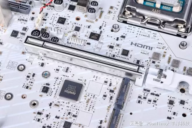 显卡插槽自然也是PCIe 5.0 x16的满血规格,采用SMT焊接工艺并加固了钢铁装甲,完美应对RTX 5090(假设)等未来重型显卡的重量与带宽需求。