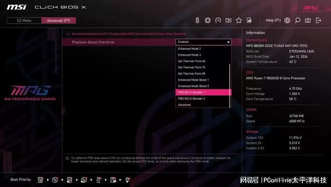 微星的“PBO Enhanced Mode”预设了多个温度墙等级(如85℃/75℃ Level),让玩家可以根据自己的散热器能力,一键优化CPU的性能释放与温度表现,无需再去烦琐地摸索负压曲线。同时我们发现PBO BCLK Booster技术居然也下放到这个主板上,但可能是测试版本BIOS的原因,应用些PBO档之后,外档调节起不了作用。