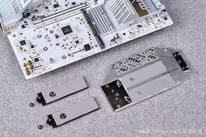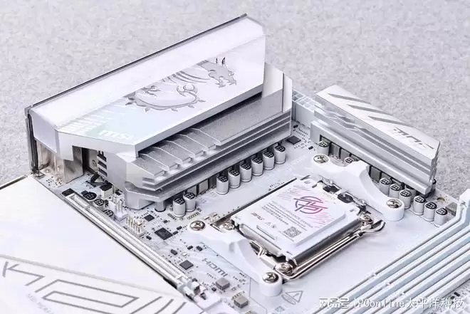 值得一提的是,微星在细节上的打磨也愈发成熟。PCB板同样采用了纯白色的基底,通过高密度的银色装甲覆盖,视觉一体感极强。