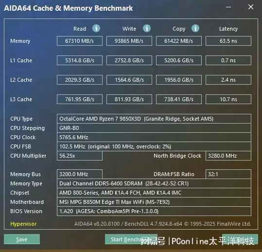 同为Gear1的情况下,进一步把内存频率提升到6400,小参也压缩到CL28-42-42-52,内存读取达到了67310MB/s,写入速度也达到了93865MB/s,延迟进一步降低至63.5ns,性能提升是相当的明显。