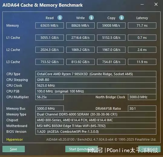 在开启了EXPO技术与高效能、低延迟功能之后,内存读取达到了63635MB/s,写入速度也达到了88626MB/s,延迟降低至71.7ns