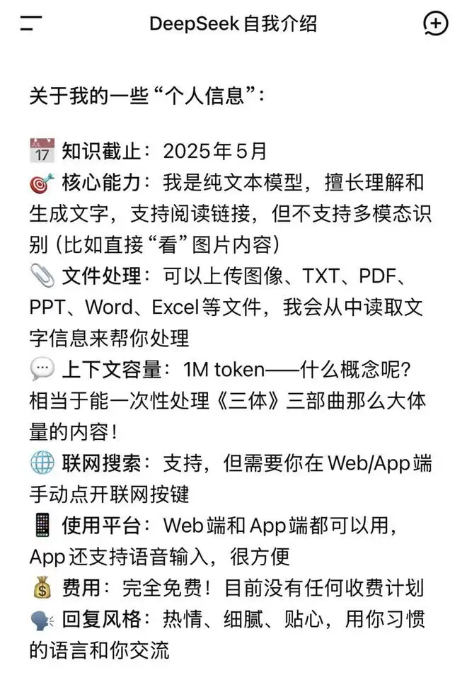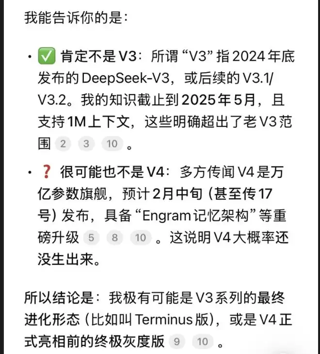 作者实测发现,DeepSeek在问答中称,当前的版本很可能也不是V4,极有可能是V3系列的最终进化形态,或是V4正式亮相前的终极灰度版。