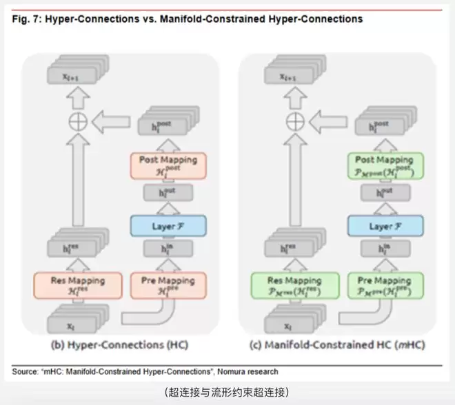 野村证券报告指出,算力芯片性能与HBM内存瓶颈,始终是国产大模型产业绕不开的硬约束。即将发布的DeepSeek V4所引入的mHC(超连接与流形约束超连接)与Engram架构,正是从训练与推理两个维度,针对上述短板进行系统级优化。