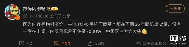 IT之家2月11日消息,博主@数码闲聊站今日爆料称,由于内存等物料成本上涨,主流TOP5手机厂商普遍下调了2026年新机出货目标,仅有一家逆势上调。内部消息透露整体目标“约7000万台”,其中中国区占比最大。不过该博主并未透露具体厂商名称。