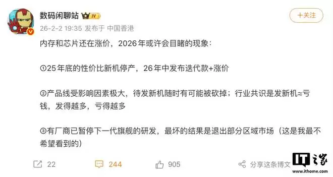 IT之家注意到,该博主此前多次提及内存芯片涨价可能引发2026年数码行业震荡,包括“已立项新机随时可能被砍”、“部分厂商暂停下一代旗舰机型研发”等情况,并指出“存储涨价对2.5K价位中端机型的冲击最为显著”。