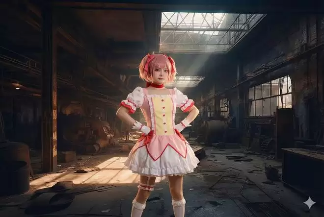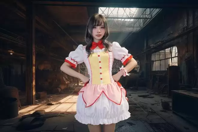 我们接着尝试,这次的目标是给原图换一套Coser服装和拍摄场地,让图1中的女孩穿着图2的Cos服装,站在图3的场景里面: