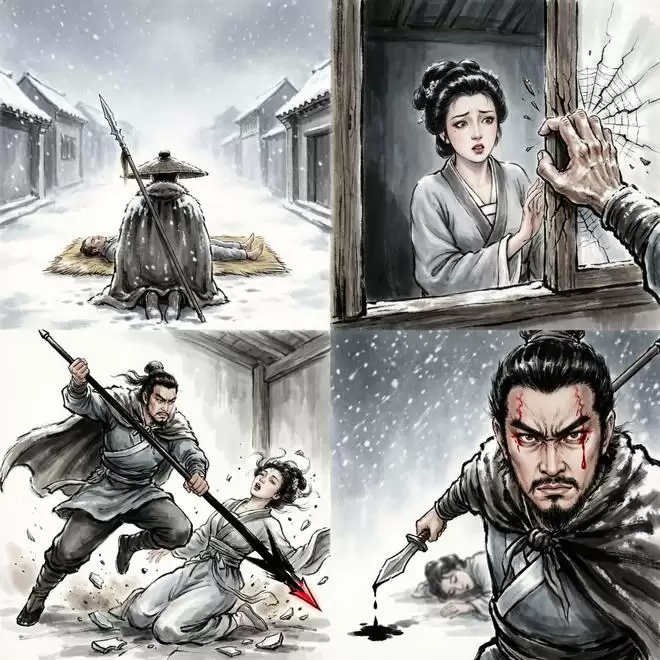再看Qwen-Image-2.0这边,个人觉得画风更偏写实,画面里的林冲是个满脸沧桑的硬汉,并没有长出动物脑袋,它很清楚“豹子头”指的是人的特征而非物种,从跪地、破窗到持枪杀敌,分镜叙事非常清晰。