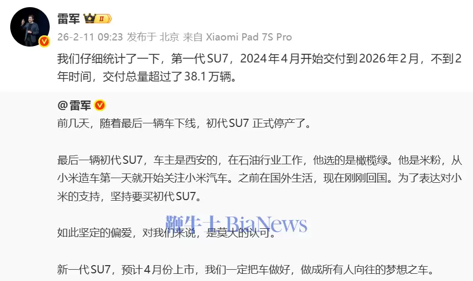雷军:小米SU7交付不到两年,累计销量突破38.1万辆