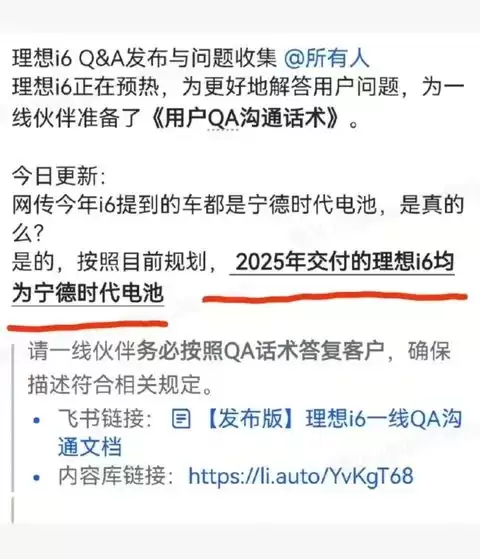 但可能是因为欣旺达的市场接受度不及宁德时代,理想i6上市前的2025年9月23日,理想汽车发布了一份《用户QA沟通话术》。
