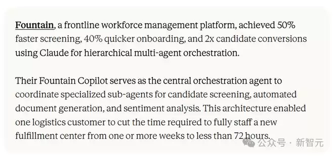 Fountain(一家前线劳动力管理平台)用Claude实现了层级化多智能体编排。他们的Fountain Copilot作为中央编排智能体,指挥专门的子智能体分别负责候选人筛选、自动文档生成和情感分析。效果是:筛选速度快50%,入职速度快40%,候选人转化率翻倍。一家物流客户把新配送中心的全面招聘周期从一周以上,压缩到了72小时以内。