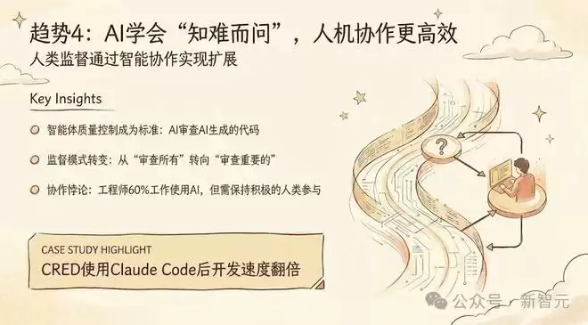 - 人类从「审查一切」转向「审查关键点」。 建立智能系统处理日常验证,只在真正新颖的情况、边界案例和战略决策时寻求人类输入。