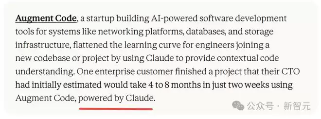 Augment Code(一家AI开发工具初创公司)的企业客户,用Claude完成了一个项目,他们的CTO原本估计需要4到8个月。最终,只花了两周。