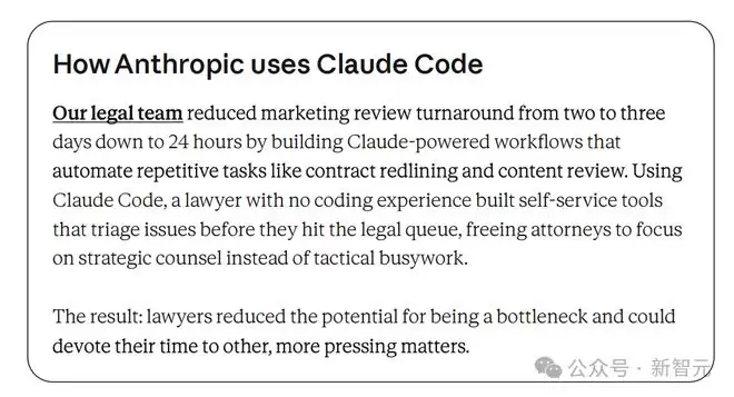 法务团队用Claude驱动的工作流,把营销审核周转时间从2-3天缩短到24小时。一位没有编程经验的律师用Claude Code构建了自助服务工具,在问题进入法务队列之前就进行分类处理,释放律师的时间去做战略性法律咨询,而非战术性的琐碎工作。