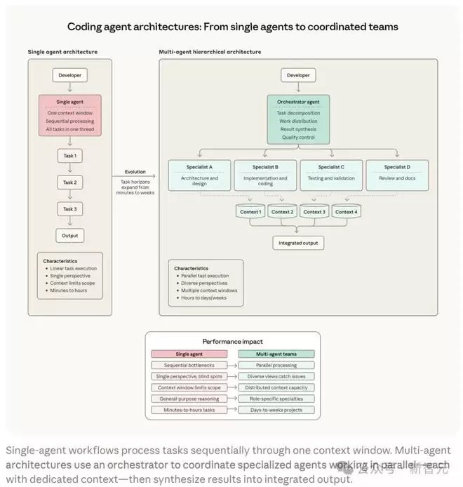 多智能体架构:一个「编排者」协调多个「专家智能体」并行工作——每个智能体有自己的专属上下文——然后汇总输出。
