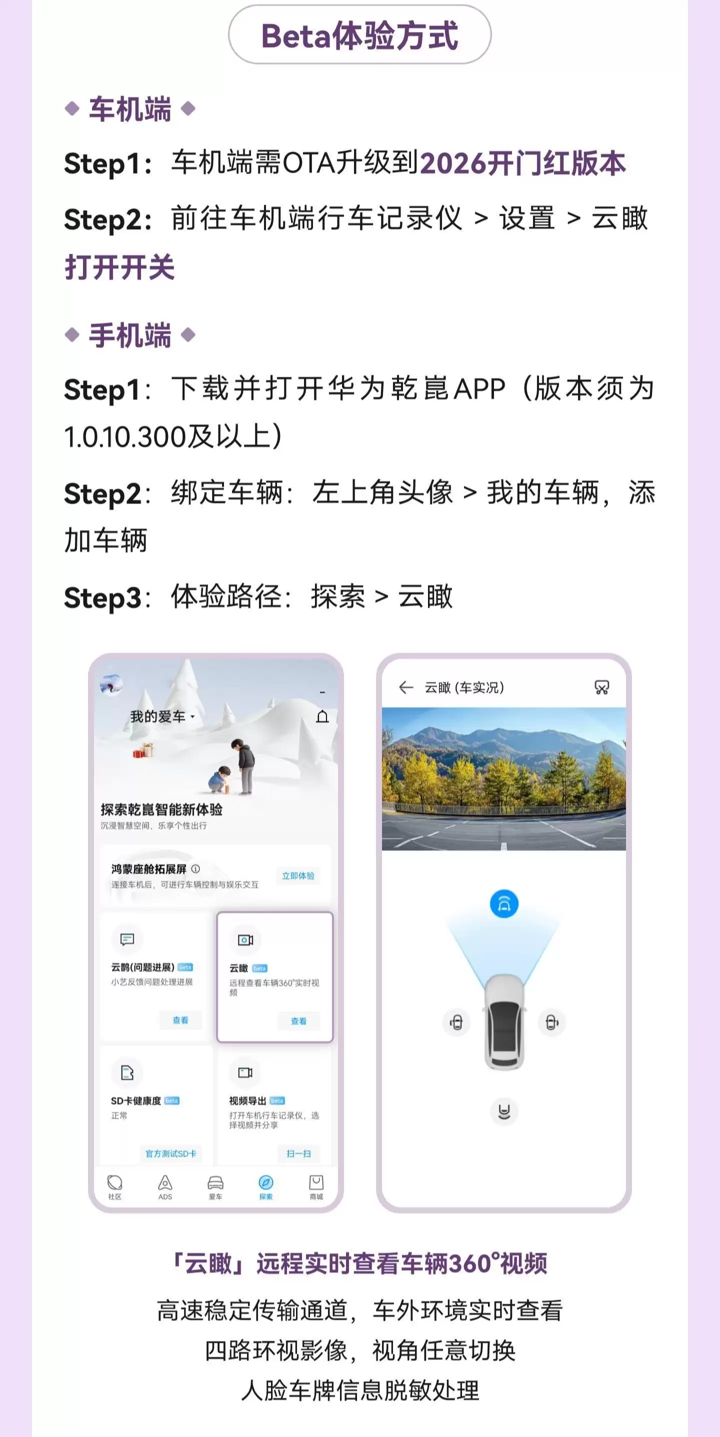 参与本次测试的用户无需支付任何费用,只需完成三个简单步骤即可启用:首先在华为乾崑App中绑定支持车型,其次将车机系统升级至最新版本,最后在行车记录仪设置中开启云瞰功能。这一流程设计充分考虑了用户体验,确保用户能够快速上手使用。