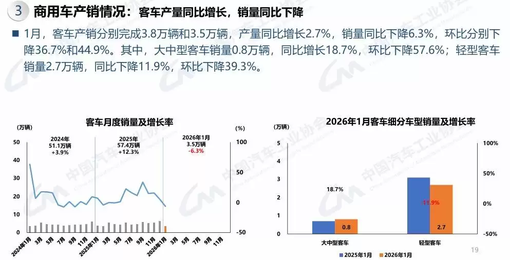 客车市场则呈现"冷热不均"格局,1月总销量3.5万辆,同比下降6.3%。其中大中型客车逆势增长18.7%,销量达0.8万辆;轻型客车受市场环境影响,销量同比下滑11.9%至2.7万辆。出口市场成为亮点,商用车整体出口量达9.3万辆,同比增长23.6%,货车和客车出口分别增长22.7%和29.5%,显示出中国商用车在国际市场的竞争力持续提升。