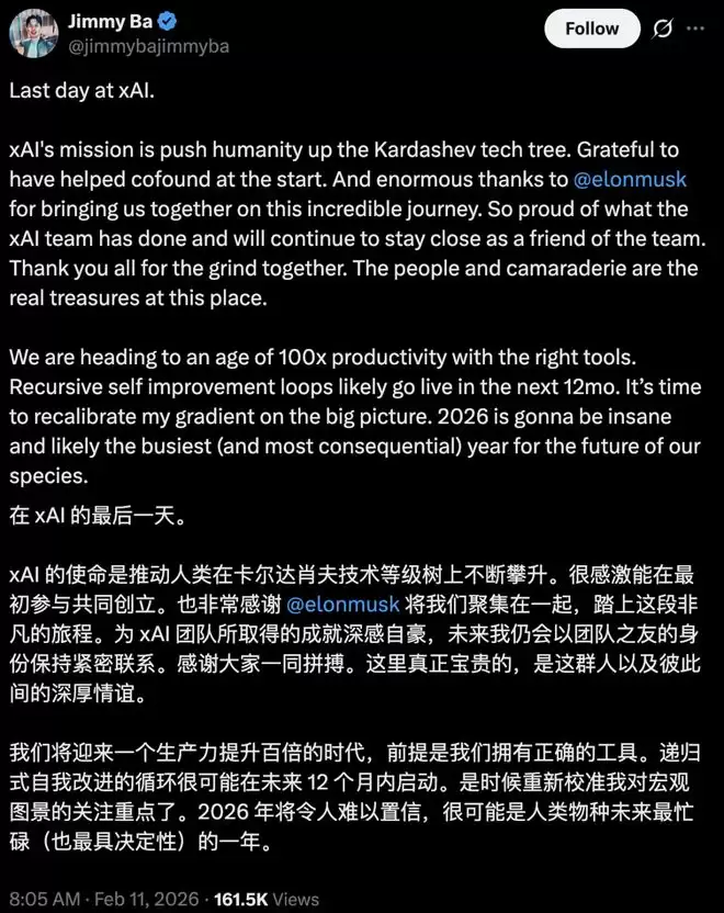 Tony Wu刚宣布离职,另一位xAI华人联创Jimmy Ba随后也在X平台发布了离职消息,称今天是自己「在xAI的最后一天」。
