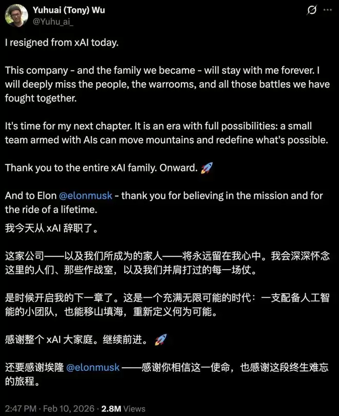最近这波离任,发生在SpaceX完成对xAI的收购几天之后。