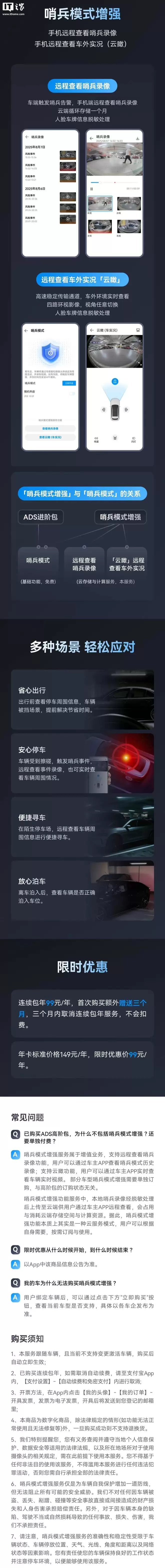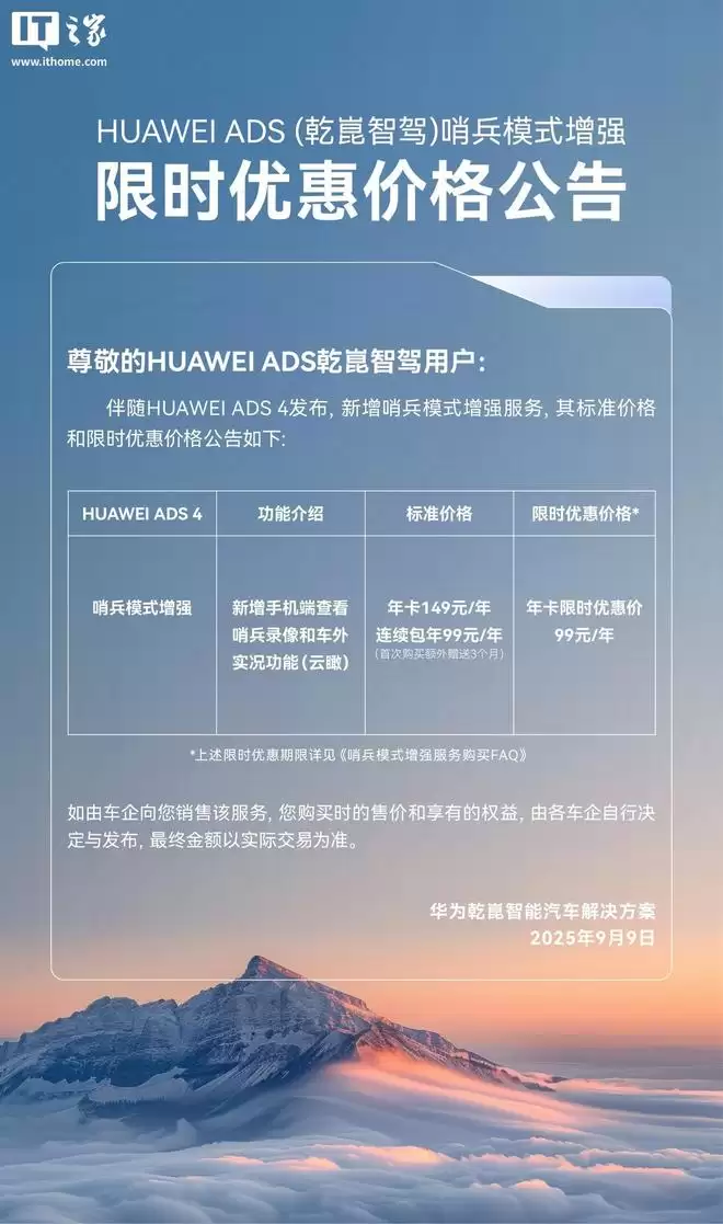 参考此前报道,去年9月9日,华为宣布推出HUAWEI ADS(乾崑智驾)哨兵模式增强,新增支持手机端查看哨兵模式录像和车外实况功能(云瞰),年卡限时优惠价99元。