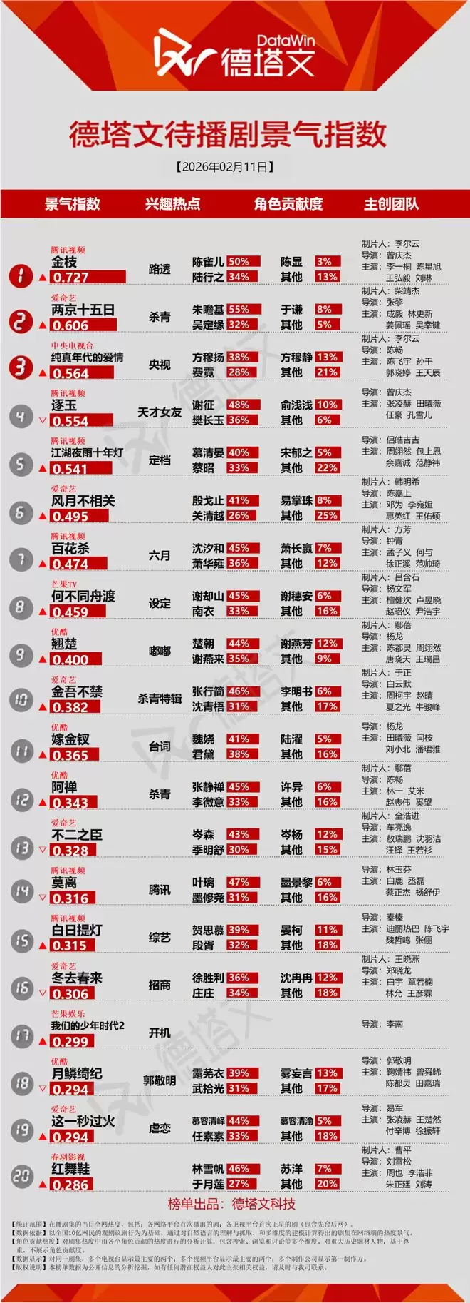 古装历史剧《两京十五日》于2月10日正式杀青,带动剧集景气指数上升。作为成毅主演、马伯庸IP改编的重点项目,该剧内容核心竞争力在于“历史+公路悬疑”的题材张力,以及金牌导演张黎的班底加持。从舆情反馈来看,杀青期间流出的“登基大典”及“骑马路透”物料,因“服化道考究”和“大片质感”获得市场正面评价。随着制作水准通过初步检验,目前市场对其的期待更聚焦在了紧张的叙事节奏能否与厚重的历史氛围完美融合。《两京十五日》由张黎、安巍执导,成毅、林更新主演,爱奇艺、稻草熊影业等联合出品。