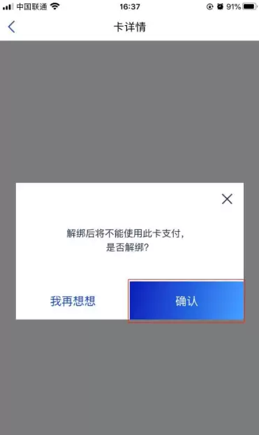 此时系统会弹出一个提示框,询问“解绑后将不能使用此卡支付,是否解绑”,请您仔细阅读后,点击提示框下方的“确认”按钮来完成操作。