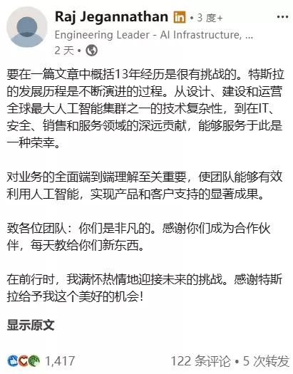 杰甘纳坦在帖子中感慨道:“短短几行文字实在难以概括这13年的点点滴滴。在特斯拉的职业生涯如同一场持续的成长蜕变。从参与设计、构建并运营全球顶尖AI集群的复杂技术工作,到在信息技术、网络安全、销售与服务领域做出重要贡献,能在此任职我深感荣幸。”
