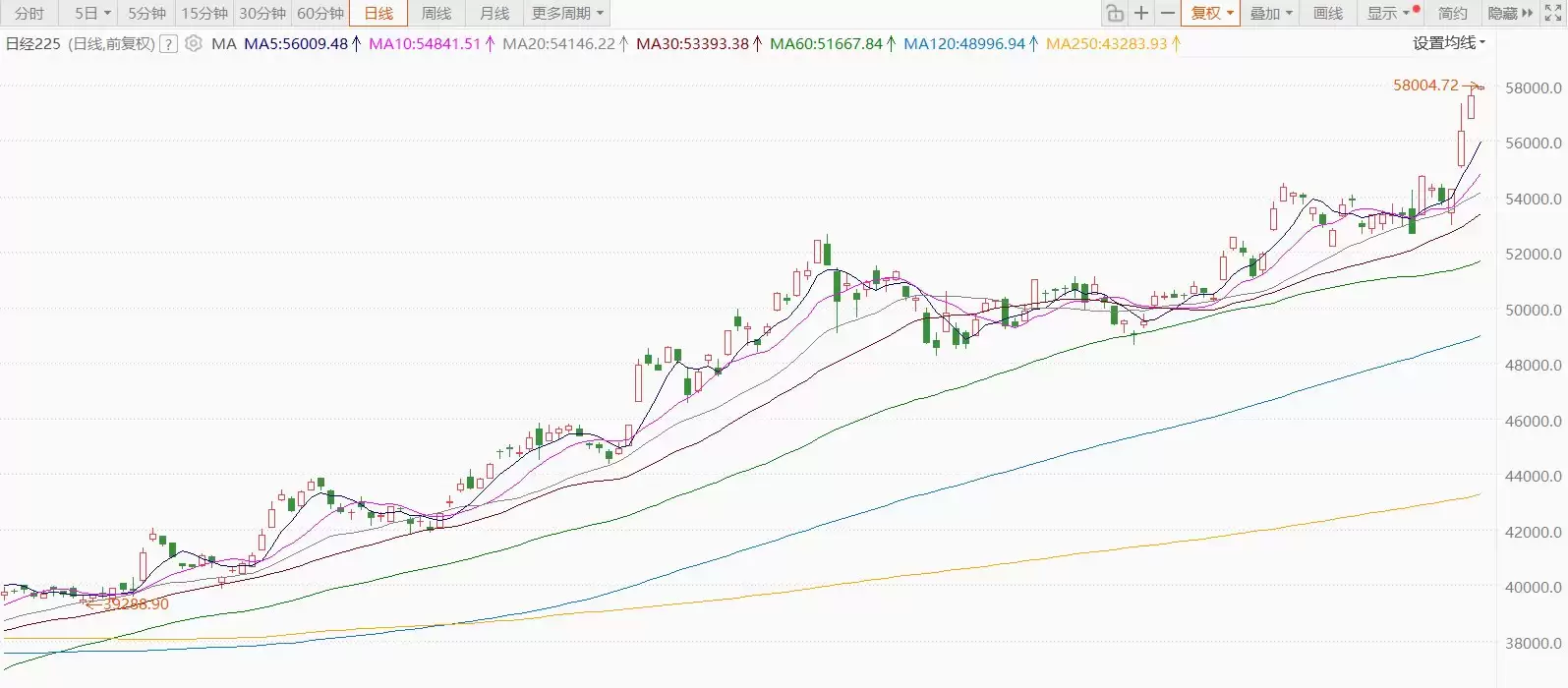 2月12日,日经225指数再次刷新纪录,首次突破58000点大关,涨幅达到0.59%。