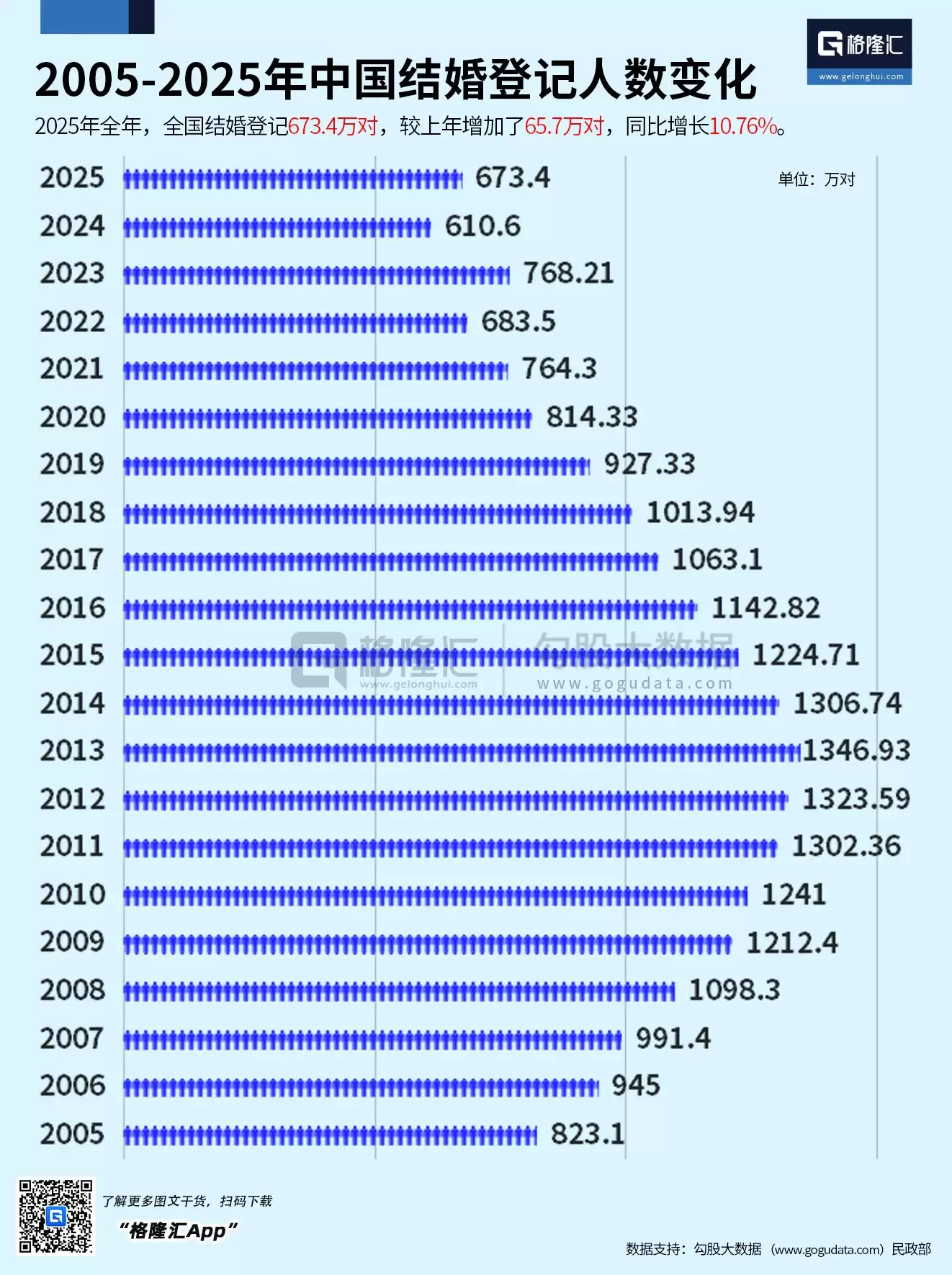 格隆汇2月12日|民政部最新公布的数据显示,2025年全国结婚登记676.3万对,离婚登记274.3万对。