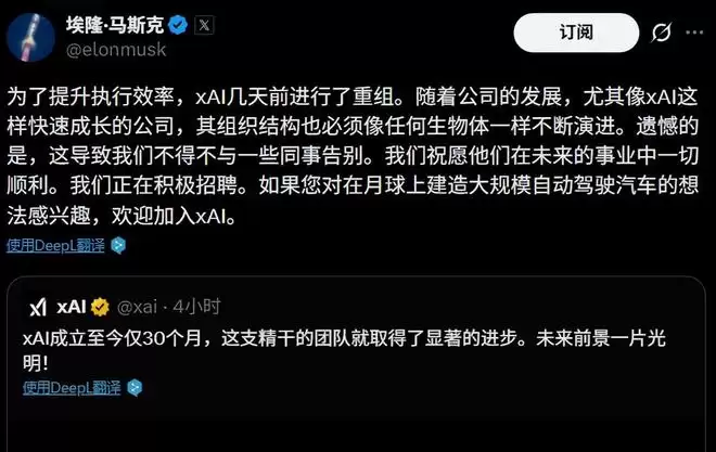 2 月 11 日,马斯克也在 X 上公开解释称,xAI 正在经历重组:“xAI 几天前进行了重组,以提高执行速度。随着公司快速增长,结构必须像任何生物一样演变。这不幸要求与一些人分道扬镳。我们祝愿他们在未来的努力中一切顺利。”这与他一个月前回应特斯拉高管离职风波时说的话形成了呼应。