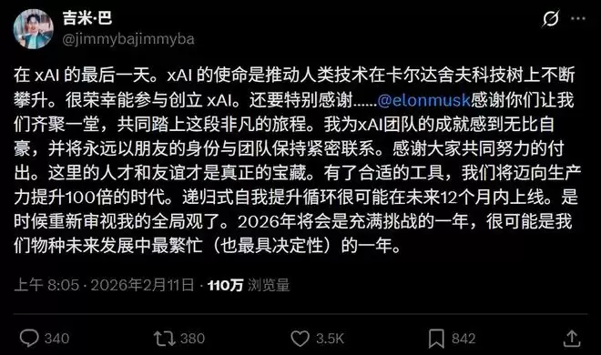 Tony 在 xAI 时负责推理团队,直接向埃隆·马斯克(Elon Musk)汇报,离职帖中,他感谢了在 xAI 的经历,同时也分享称,“这是开启下一章的时机”;最新离职的 Jimmy 则负责研究、安全和企业业务,他在离职声明中表示将重新聚焦“大局”,指出 2026 年将是 AI 进步的关键一年。不得不说,二位已经算是很体面地与 xAI 分手了。