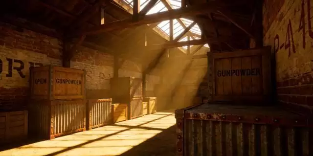 特点:钉铁皮的木箱、英文标识(GUNPOWDER/OPIUM)、火灾戏。