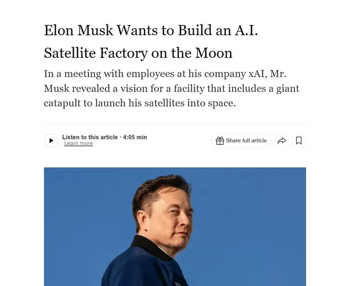 “我们要在月球上架起‘巨型弹射器’,把AI卫星一颗接一颗地射向深空。”